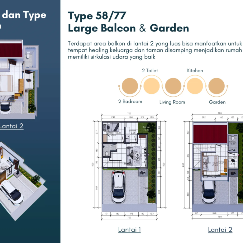 Terdapat area balkon di lantai 2 yang luas bisa manfaatkan untuk tempat healing keluarga dan taman disamping menjadikan rumah memiliki sirkulasi udara yang baik