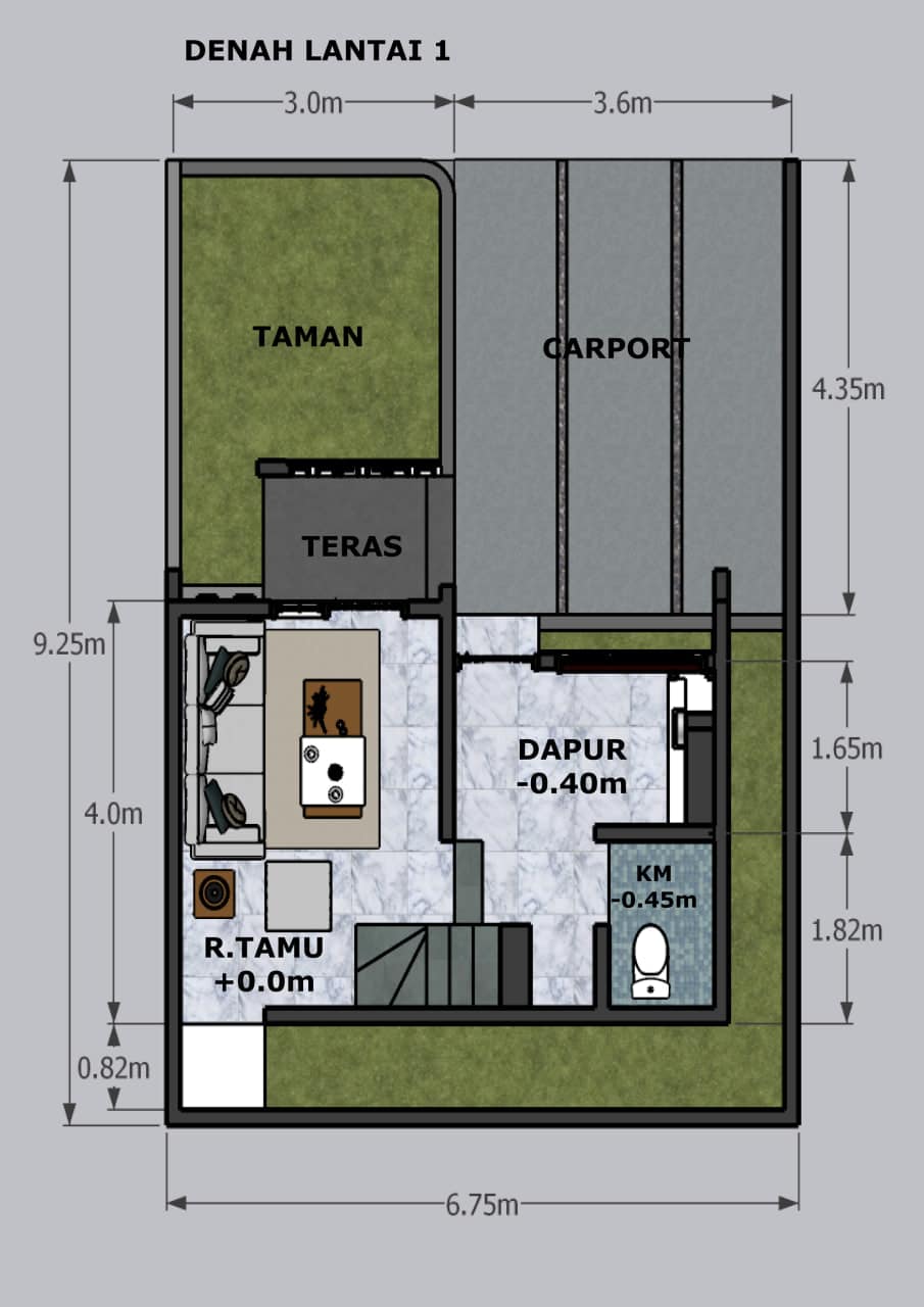 – Lantai 1 : Tile 60×60 (Utama), Keramik 30×30 (K.Mandi)